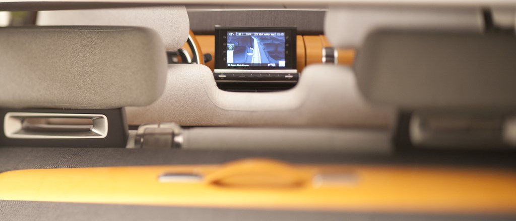 Questo nuovo approccio strutturale si estende anche ai sedili anteriori: disegnati come un sofà, confortevoli e conviviali. Comfort migliorato anche grazie al tetto panoramico, dotato di trattamento termico, che lascia passare la luce ma non il caldo. Protegge dai raggi UV, con proprietà analoghe agli occhiali di categoria 4. I sedili e le porte sono rivestiti con una combinazione di due materiali, ispirati agli arredi contemporanei: Tessuto di cotone blu chiné e pelle color cammello, a colorazione vegetale, che ritorna anche sulla plancia e sul volante. Per il vano superiore della plancia e le maniglie delle porte i designer hanno tratto ispirazione dal mondo della valigeria.