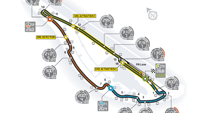 ► Ci saranno due zone di DRS, con un unico detection point, 110m dopo la curva T9. Il primo activation point è 55m prima della curva T12, il secondo 70m dopo la curva T14.