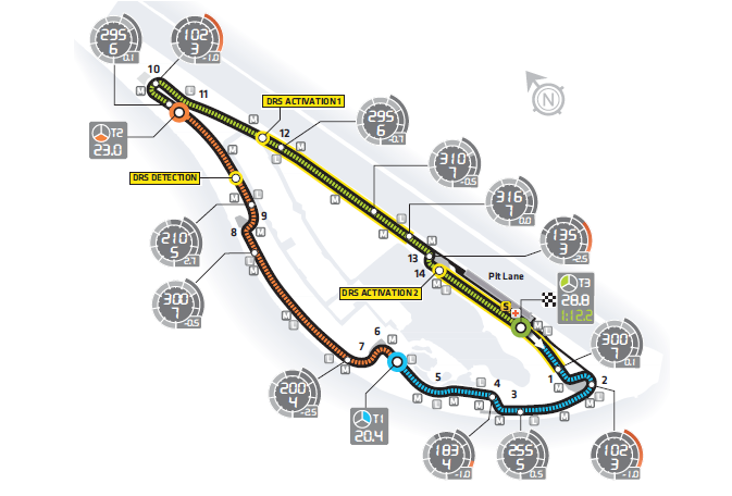Il lungo tracciato è una serie di rettilinei veloci collegati da curve lente. La natura start-stop del giro, in cui le monoposto superano i 300 orari in quattro distinte occasioni, prima di frenare fino alla prima o seconda marcia, stressa molto i freni e i motori, ma quest’anno anche l’MGU-K, che dovrà gestire questi notevoli carichi in frenata, e l’MGU-H, che avrà a che fare con le esigenze del turbo.