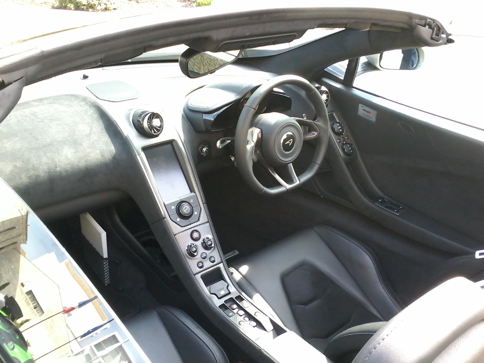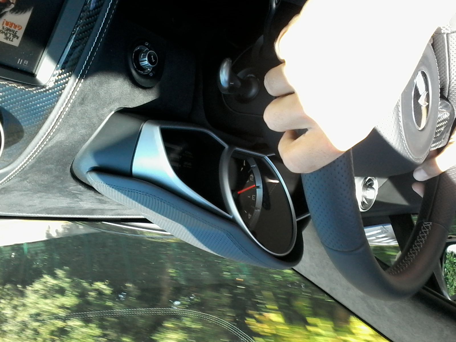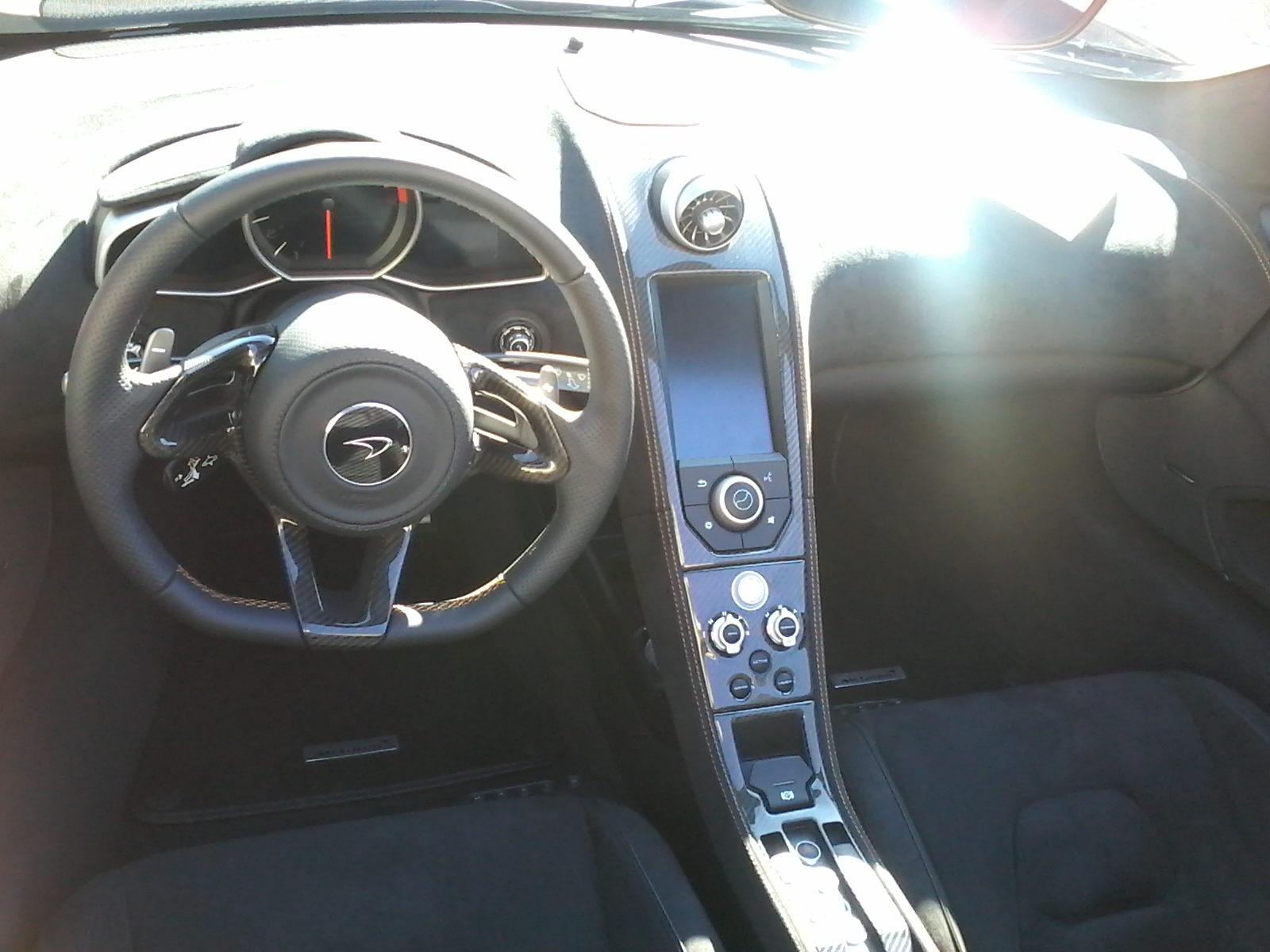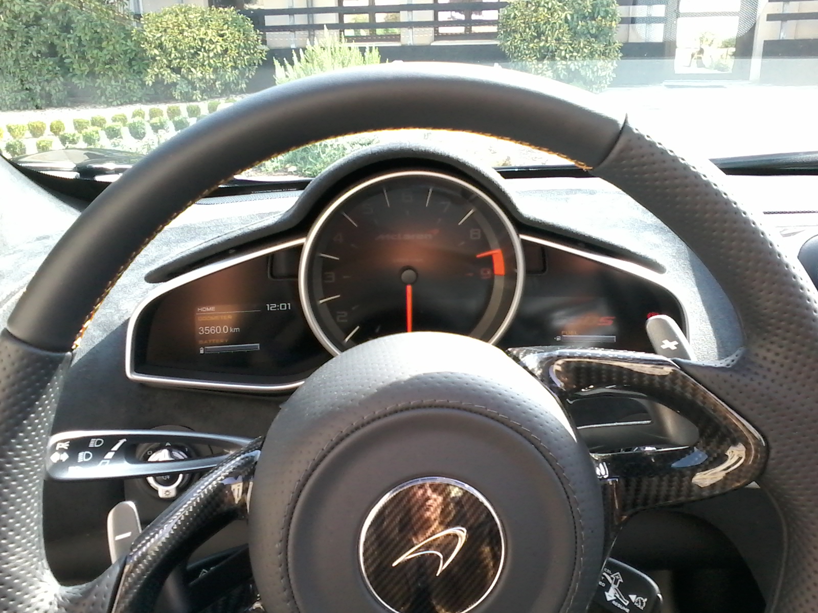 20140922_173807L’interno è… da viverci! L’abitacolo è interamente rivestito di serie in leggero tessuto Alcantara o in pelle, materiali che avvolgono l’intero padiglione, volendo con cuciture a contrasto. I sedili racing a schienale fisso, in carbonio, basati sul leggero design utilizzato per la McLaren P1, offrono un eccellente livello di supporto per gambe e schiena, migliorando il coinvolgimento del guidatore e riducendo il peso complessivo di 15 kg.