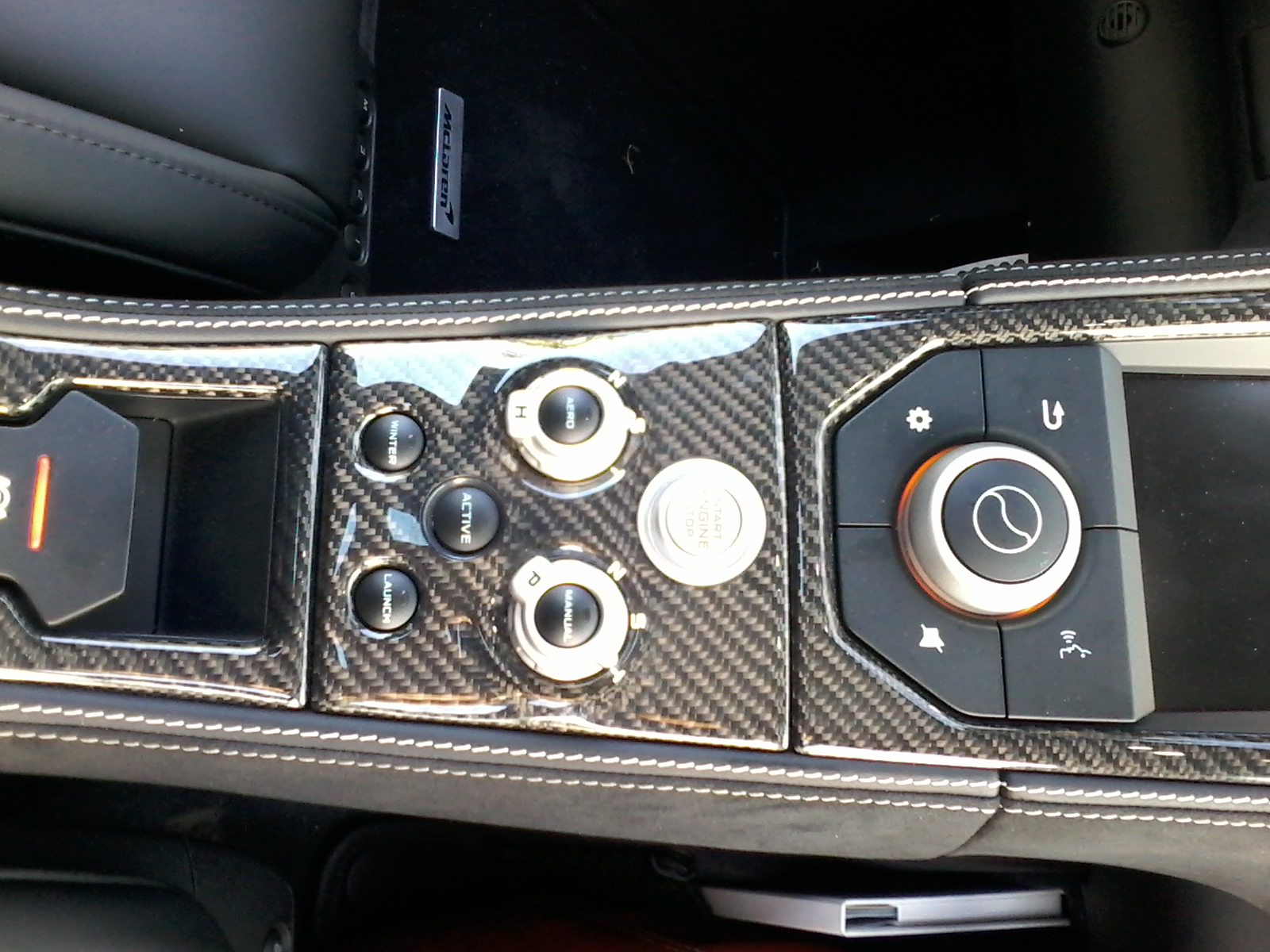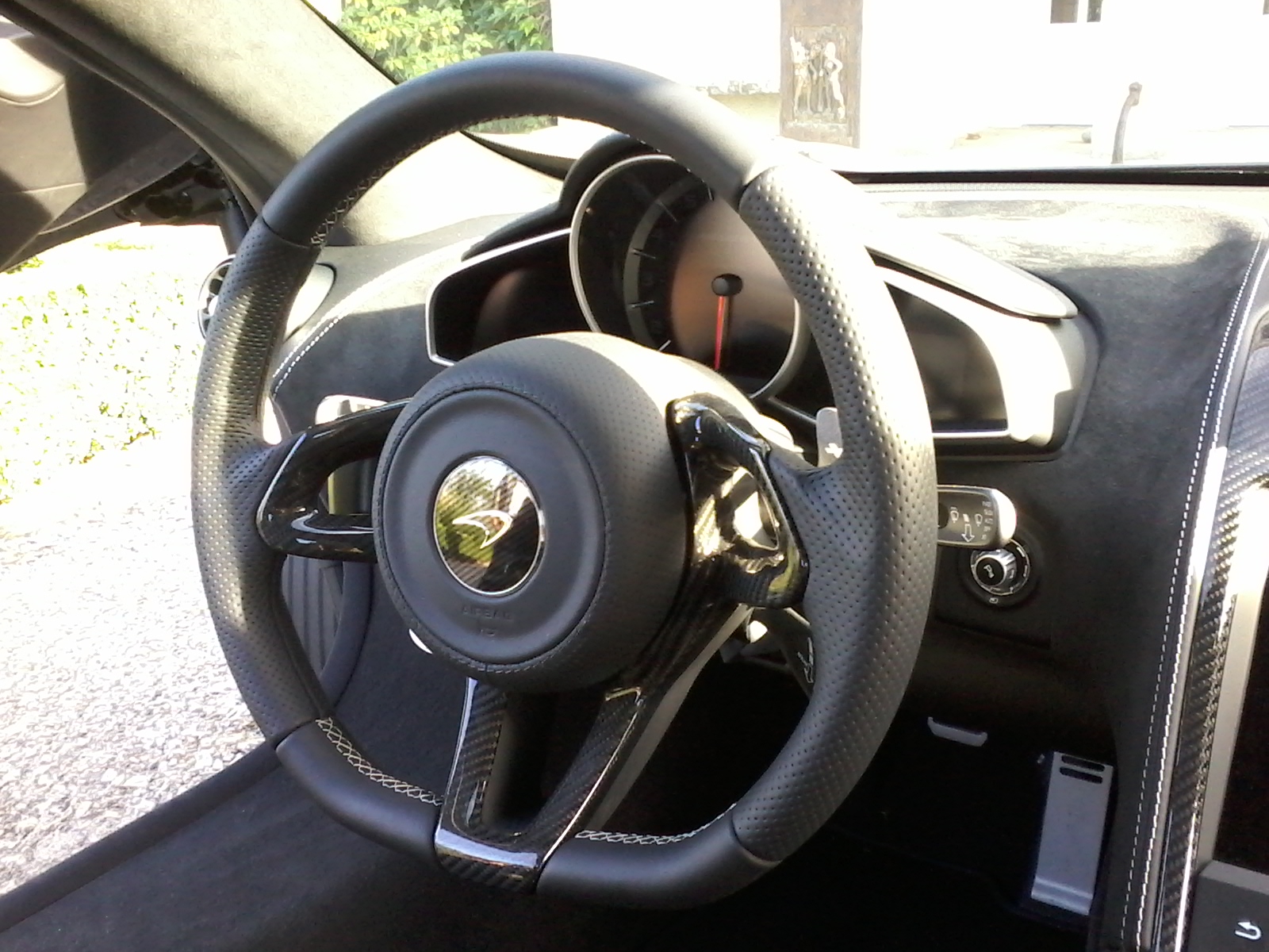 20140922_173807L’interno è… da viverci! L’abitacolo è interamente rivestito di serie in leggero tessuto Alcantara o in pelle, materiali che avvolgono l’intero padiglione, volendo con cuciture a contrasto. I sedili racing a schienale fisso, in carbonio, basati sul leggero design utilizzato per la McLaren P1, offrono un eccellente livello di supporto per gambe e schiena, migliorando il coinvolgimento del guidatore e riducendo il peso complessivo di 15 kg.