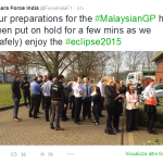 Tutti col naso all’insù, questa mattina, per osservare uno dei fenomeni sicuramente più affascinanti e misteriosi in natura: l’eclissi di sole. Per la prossima gli esperti dicono che dovremo aspettare fino al 2026, quindi un evento magico e ancor più speciale quello di oggi 20 marzo, che coincide anche con l’equinozio di primavera. Neppure il mondo della Formula 1 si è sottratto allo spettacolo e su Twitter è stato tutto un proliferare di cinguettii… ne abbiamo raccolti alcuni per voi, tanto per prendersi un break che ogni tanto fa bene, no? P.S.: che eclissi ha visto Pastor Maldonado?!? Buona visione, con un sorriso!