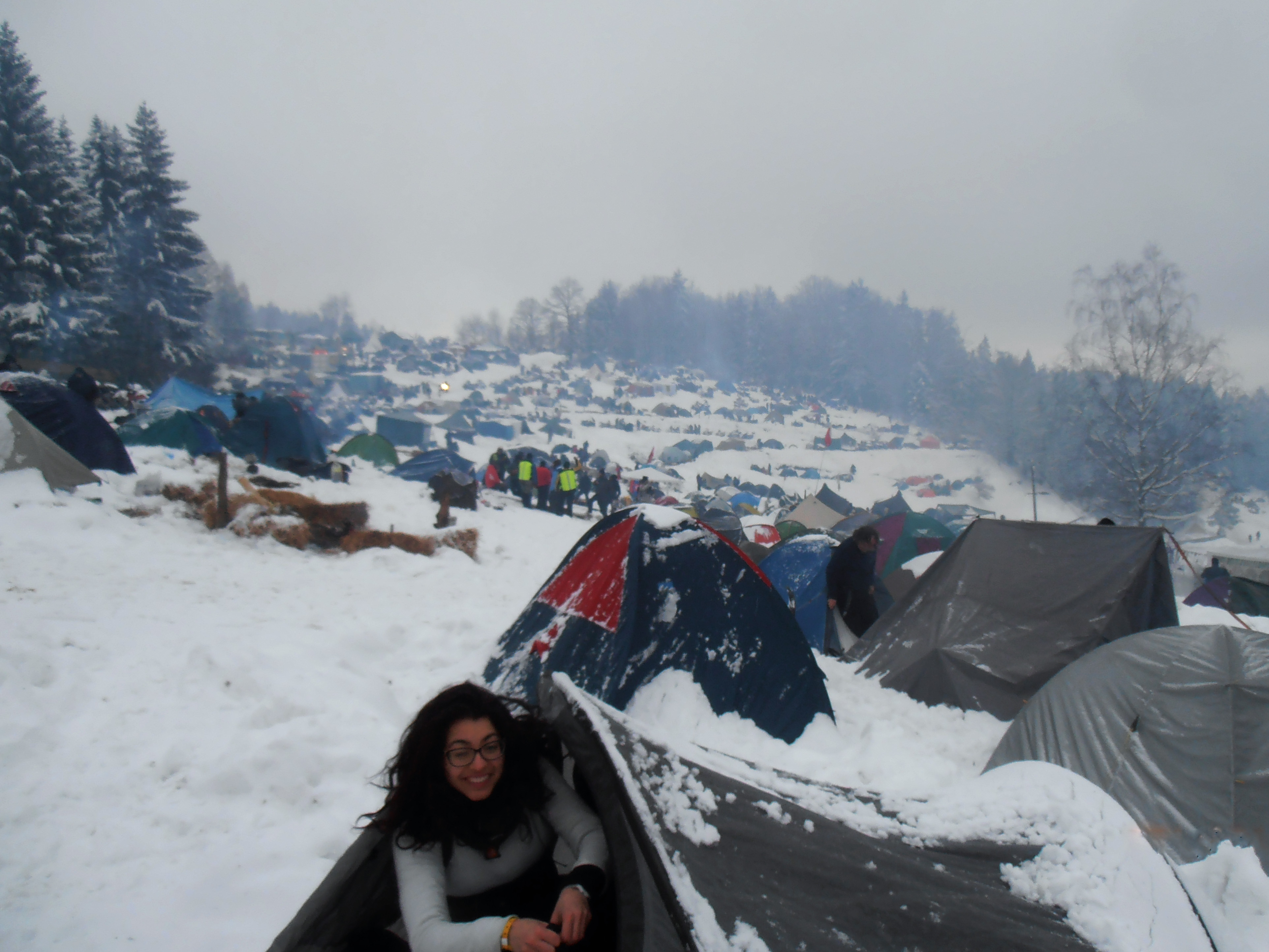 la nostra roba e cerchiamo un posticino per accamparci, ci piazziamo tra alcune tende e iniziamo a spalare un pò di neve. Ovviamente era talmente tardi che la paglia da isolante per la tenda era già finita, ma nel giro di pochi minuti veniamo accolti calorosamente da tutti i nostri nuovi vicini di casa. C’è chi ci offre da bere, chi da mangiare, chi ci presta il badile per scavare nella neve. La cosa più bella è stata sicuramente conoscere nuove persone lasciandoci trasportare dai racconti dei loro viaggi insieme seduti attorno a un fuoco.