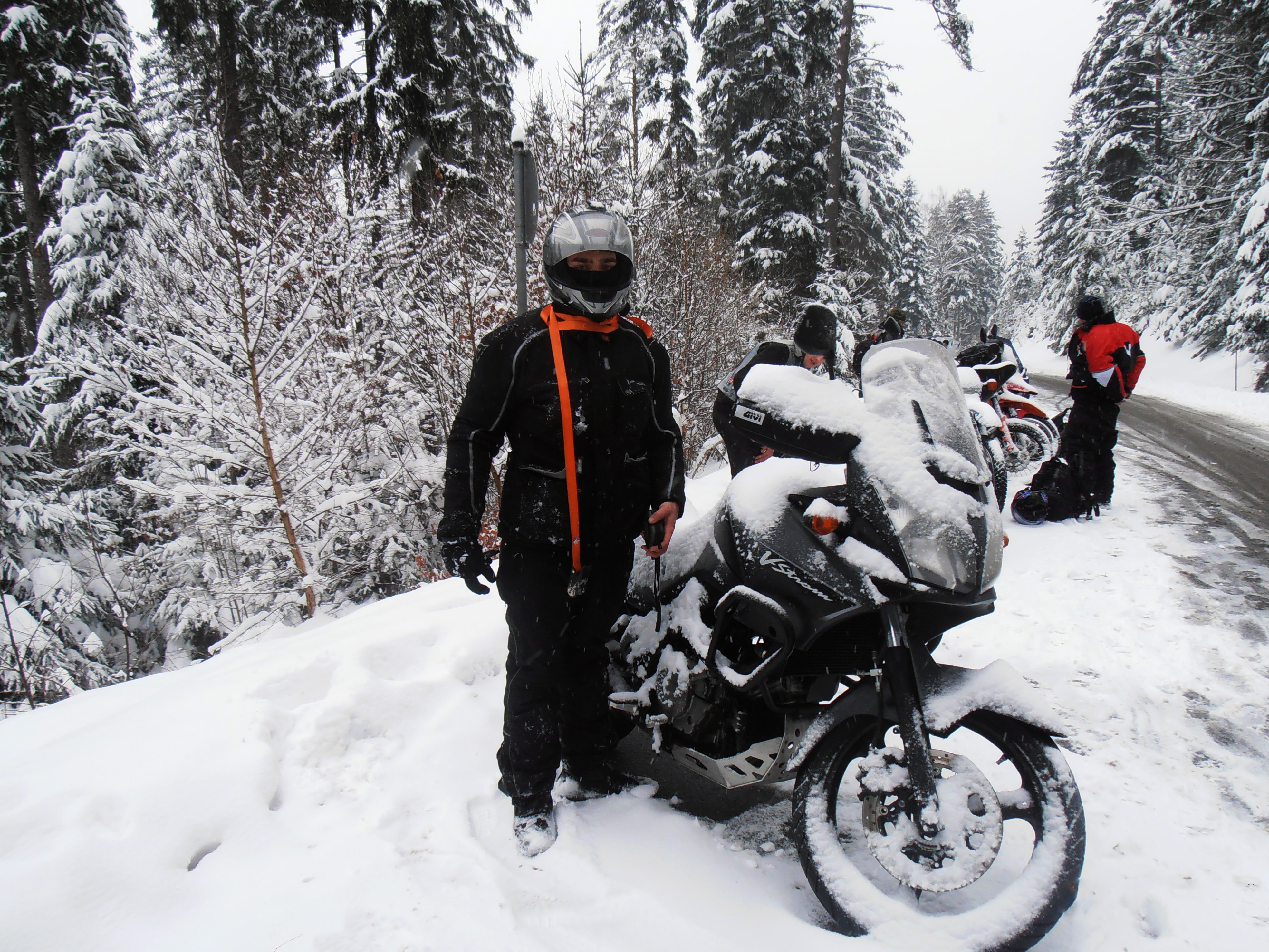 La mattina seguente, dopo aver dormito qualche ora ci svegliamo infreddoliti e scopriamo che sta nevicando abbastanza forte, ma un tedesco, probabilmente ancora ubriaco dalla notte, decide comunque di dare un buongiorno a tutti gettandosi nel laghetto ghiacciato della buca. Questa è la follia tedesca di cui parlavamo! Quando decidiamo di rientrare, la moto si accende al primo colpo e via che si torna a casa prima che le strade si riempano di neve. Record della temperatura toccata di giorno: -7°C, come 7 erano gli strati che avevamo addosso per ripararci dal freddo. Un bel fresco ma ne è valsa la pena!