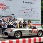Il momento più emozionante della Mille Miglia 2015 è stato vedere Stirling Moss ripercorrere Viale Venezia sulla Mercedes-Benz 300 SLR, con la quale detiene la media record di oltre 157 km/h, ottenuta nella vittoriosa edizione del 1955. Per celebrare la vittoria record alla Mille Miglia del 1955, Mercedes-Benz ha varato un’operazione dai tratti romantici, portando a Brescia le tre “frecce d’argento”, le 300 SLR che disputarono la corsa di quell’anno. A bordo della vettura numero 722, numero che indica l’ora di partenza, c’era ovviamente il trionfatore di quell’edizione, Stirling Moss, purtroppo non in compagnia di Denis Jenkinson, scomparso alcuni anni orsono.