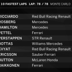 Altri momenti topici di questo GP? La collisione tra Fernando Alonso e la Force India di Nico Hulkenberg al Mirabeau al via, col tedesco contro le barriere e 5″ di penalità allo spagnolo (per quello che era un incidente di gara…). Un peccato per Alonso, unico tra i leader a essere partito sulle soft e la cui strategia avrebbe potuto pagare. Ma dopo il pitstop (solo allora il team gli ha detto della penalità, probabilmente per non togliergli concentrazione) è stato