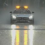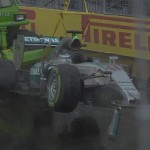 Solo la Mercedes, con coraggio, manda i suoi piloti in pista, ma con risultato non positivo. L’errore di mettere le vetture sul tracciato con gomme intermedie, quando la quantità d’acqua richiedeva quelle da bagnato estremo, gioca un brutto scherzo a Lewis Hamilton, già autore di qualche errore in giornata. L’inglese galleggia senza possibilità di recupero alla frenata della curva 10, e va a sbattere frontalmente sulle gomme di protezione a bassa velocità, rovinando comunque il muso della Mercedes.