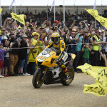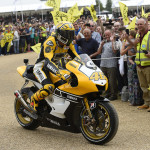 The unveiling of Rossi‘s bike was followed by the Doctor delighting thousands of spectators when he rode up and down the 1.16-mile Hillclimb in the yellow livery at 11:40 am. The special colour scheme of his YZR-M1 was similar to the one he and Colin Edwards sported ten years ago when they marked Yamaha‘s 50th anniversary at the Raceway Laguna Seca with a double podium.