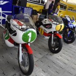 Rossi‘s yellow bike was in good company at the Yamaha exhibition; other iconic show bikes on display were Phil Read‘s 1965 RD56, Giacomo Agostini‘s 1975 YZR500 OW23 and Kenny Roberts‘s 1978 YZR750 OW31.