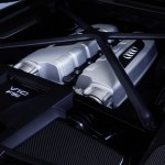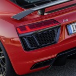 questo grazie soprattutto all’Audi Space Frame (ASF) di nuova concezione in struttura multimateriale, che comprende componenti in alluminio e in fibra di carbonio; la carrozzeria grezza, molto rigida, pesa circa solo 200 chilogrammi. Il sottoscocca, come nelle vetture da corsa, è dotato di un rivestimento liscio; un grande diffusore convoglia l’aria in modo mirato e aumenta la deportanza della R8 V10 plus: alla velocità massima viene esercitata una forza di 40 kg sull’asse anteriore e di 100 chilogrammi sull’asse posteriore. Un risultato eccellente cui contribuisce anche il grande alettone in fibra di carbonio.