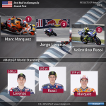 Marc Marquez (Repsol Honda) vince il Red Bull Indianapolis Grand Prix 2015 precedendo sul mitico Brickyard il connazionale Jorge Lorenzo (Movistar Yamaha MotoGP). Per il campione in carica si tratta della terza vittoria della stagione, la seconda consecutiva dopo quella del Sachsenring e la quinta consecutiva qui a Indianapolis (due in Moto 2 e tre in MotoGP).