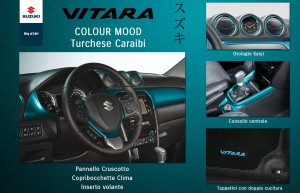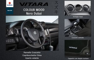 Suzuki VITARA è proposta in due versioni, V-COOL e V-TOP. Le versioni con carrozzeria Bi-COLOR sono equipaggiate con il pacchetto V-MORE, un insieme di finiture (interne ed esterne) in grado di enfatizzare le linee esclusive del nuovo SUV Suzuki. Alle numerose opzioni di allestimento, dai motori 1.6 diesel e benzina fino alla trazione 2WD oppure 4WD ALLGRIP, i nuovi Colour Mood offrono all’utente l’occasione per sottolineare lo stile unico degli interni di VITARA personalizzando la propria auto attraverso sei differenti colorazioni: Nero Dubai “Lucido”, Arancione Grand Kanyon, Turchese Caraibi, Bianco Artico, Avorio Africa e Rosso Marrakech. Le molteplici opzioni offrono una vasta possibilità di scelta, abbinandosi elegantemente alle vetture con carrozzeria in bianco o nero, oppure prestandosi ad intriganti abbinamenti “a contrasto”.