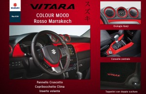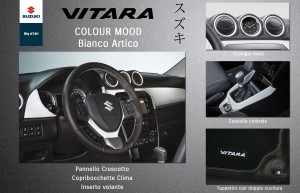 caratterizzano in modo vivace e al contempo elegante il pannello del cruscotto, i profili delle bocchette del climatizzatore, il volante e la consolle centrale. Includono l’esclusivo orologio analogico Kanji e i tappetini personalizzati VITARA rifiniti con doppia cucitura a vista. I Colour Mood sono proposti a 250,00 € – IVA e installazione compresi.