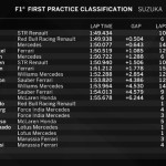 Jenson Button ha aspettato quasi mezz’ora prima di uscire dal box, lamentando poi un forte sottosterzo e chiudendo 12°, a 3.584s. Solo 16° la Williams di Felipe Massa (alle spalle della Lotus di Romain Grosjean), a 4.5s, mentre Valtteri Bottas è stato l’unico pilota a non scendere in pista (scusa ufficiale: risparmiare le wet, anche se per il resto del weekend non si prevede pioggia).