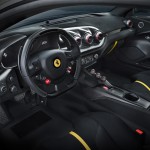 dottata una soluzione a triplice coppia di sciabole derivate dalle competizioni GT che contribuiscono al 30% dell’aumento del carico rispetto alla F12berlinetta. Il diffusore posteriore è stato completamente ridisegnato e dotato di un sistema di 3 portelle attive. È stato diviso in tre canali ed equipaggiato di derive curve e profili alari verticali per aumentare la potenza delle strutture vorticose e favorire l’espansione del flusso anche sul piano orizzontale. Questi profondi interventi aerodinamici hanno contribuito a creare praticamente una vettura nuova che si stacca molto anche dal punto di vista estetico dalla F12berlinetta.