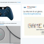 Presso lo stand Ford, in cui tutti gli elementi grafici erano costituiti da immagini costituite da emoticon con la tecnica del mosaico, si è svolto un panel sul tema della responsabilità al volante, nel quale è stata evidenziata l’importanza nella distinzione tra la guida reale e quella virtuale, quest’ultima da sempre protagonista delle serie di maggior successo nell’industria dei videogiochi. Per l’occasione, Ford ha realizzato un video utilizzando la medesima tecnica creativa della campagna, completamente ‘emojizzato’, che mostra le conseguenze dell’utilizzo dello smartphone al volante: