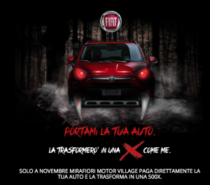 Nella notte del 31 ottobre, tradizionale ricorrenza di Halloween, circa 2.000 auto della concorrenza parcheggiate nel centro di Torino sono state vittima di un originale morso vampiresco: un magnete a forma di 500X, che nella grafica ricorda però proprio un vampiro, è stato posto su migliaia di vetture di marchi concorrenti di FCA insieme a un gadget a forma di denti di vampiro e al messaggio “Il mio morso è solo l’inizio… HalloweeX. Ora trasformala in una 500X”.