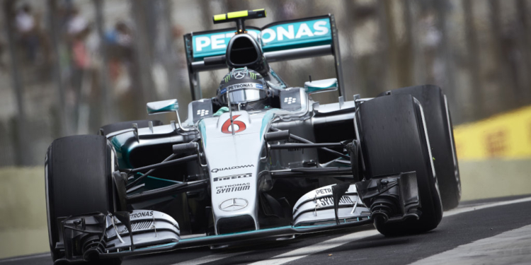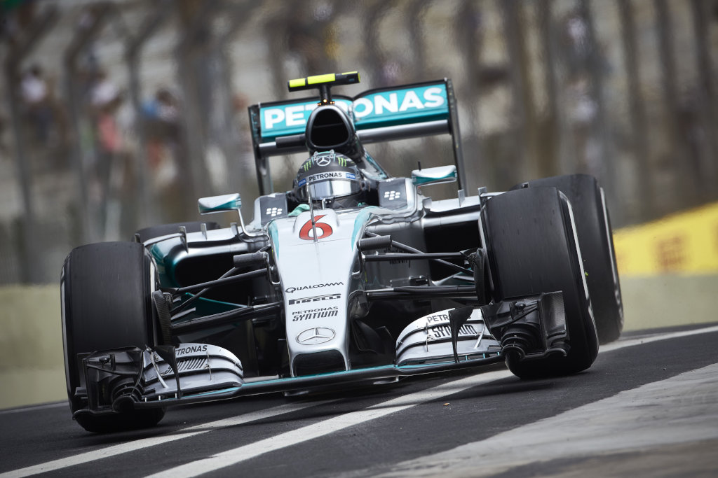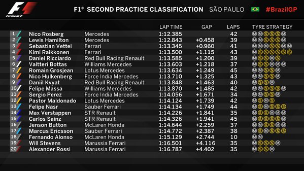 Al termine delle seconde prove libere del GP del Brasile, miglior tempo per la Mercedes di Nico Rosberg (1.12.385) davanti al compagno di squadra Lewis Hamilton (1.12.843). Seconda fila virtuale per le Ferrari di Sebastian Vettel (1.13.345) e Kimi Raikkonen (1.13.500). Per i due piloti della Scuderia