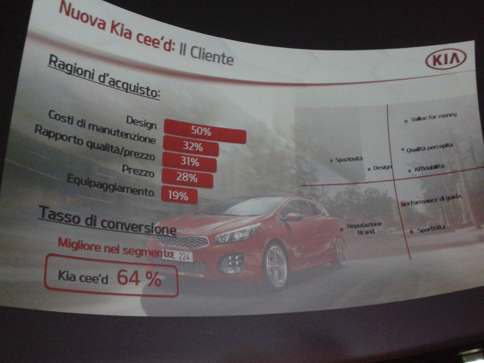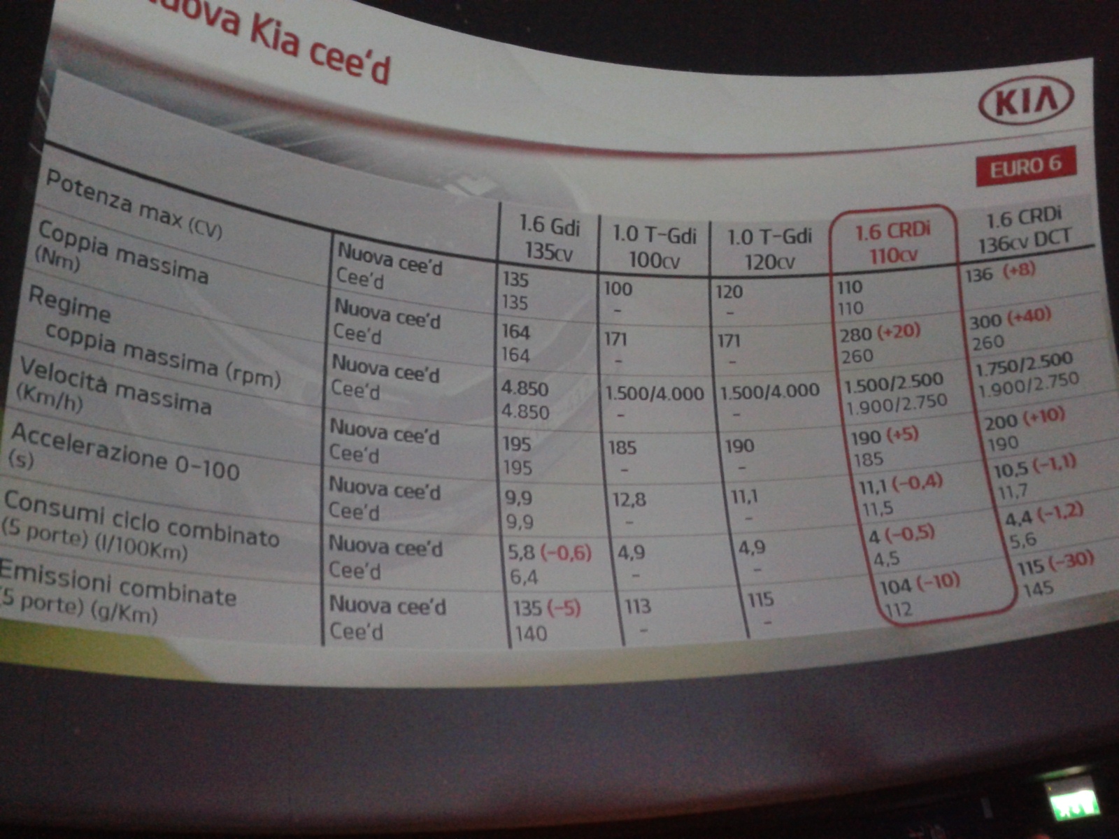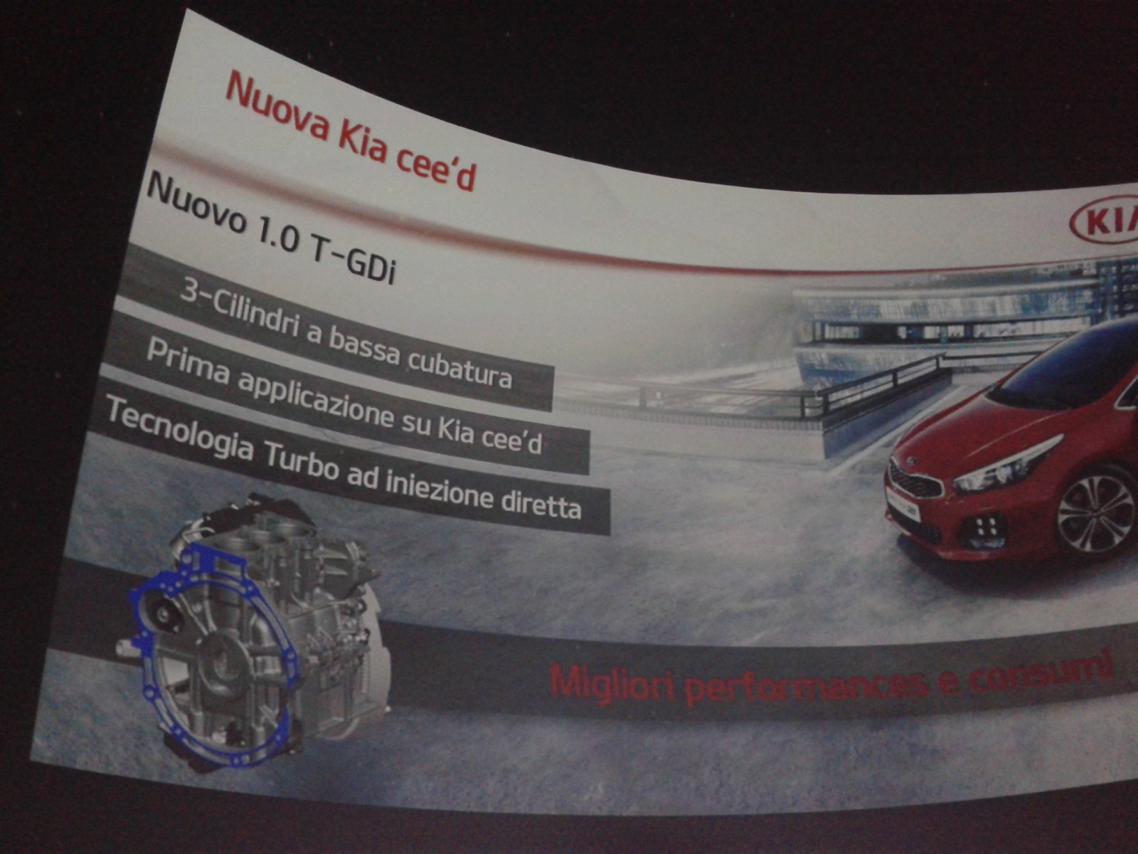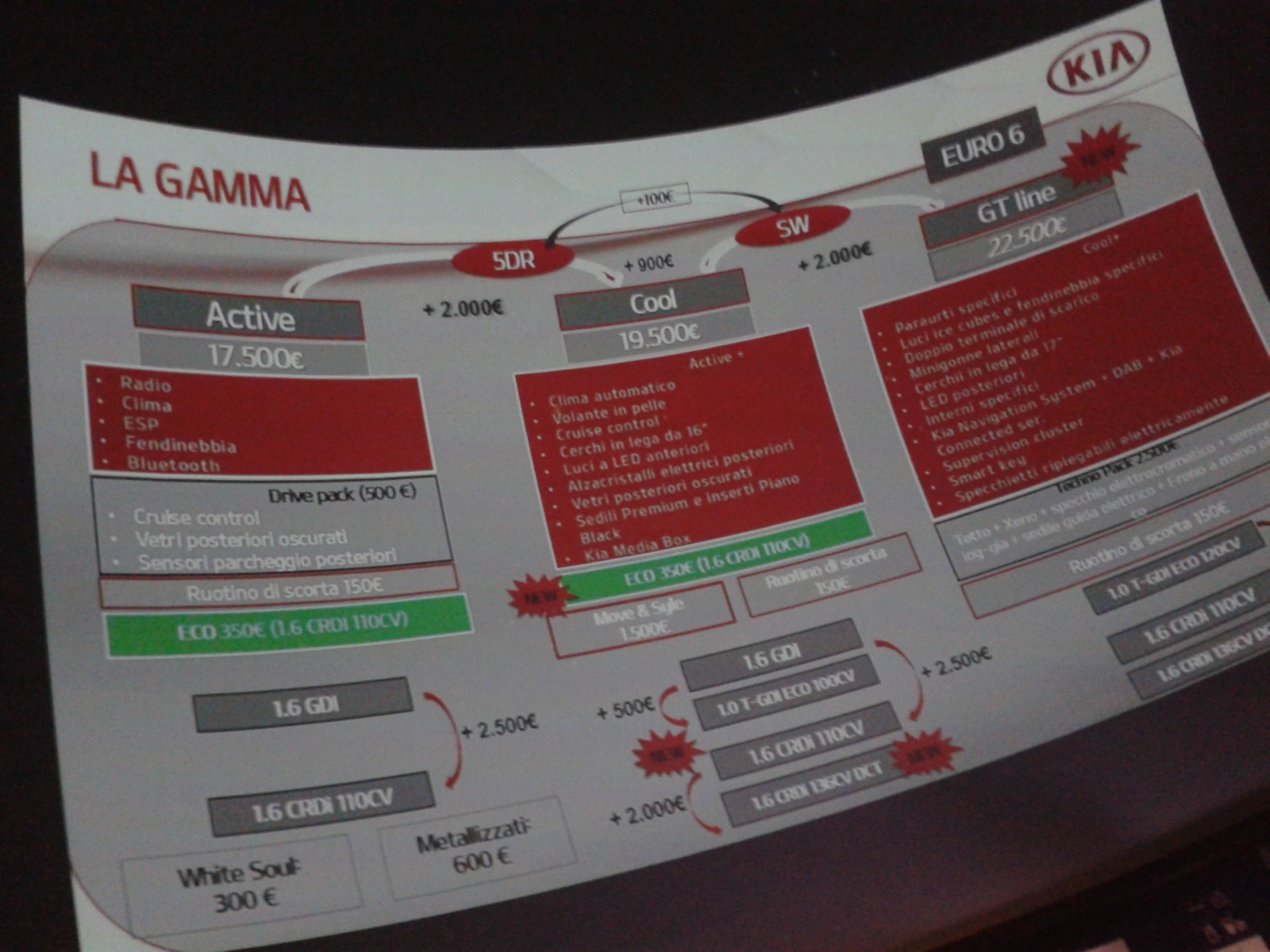 rtante, ma anche con tre assolute novità: il nuovo (e primo per Kia) tre cilindri 1.0 litri T-GDI (Turbo Gasoline Direct Injection) offerto in due versioni con potenze di 100 e 120 CV; il cambio automatico a doppia frizione proposto di serie con il motore diesel 1.6 CRDi nella versione da 136 CV, senza il quale sarebbe stato praticamente impossibile contrastare il dominio tedesco all’interno del segmento C; e la versione GT Line, quella che, grazie ai fari con tecnologia LED, i cerchi in lega da 17”, interni in pelle e ai vari badge e loghi posizionati su tutta la vettura, dovrebbe attirare l’attenzione di una clientela particolarmente sportiva.
