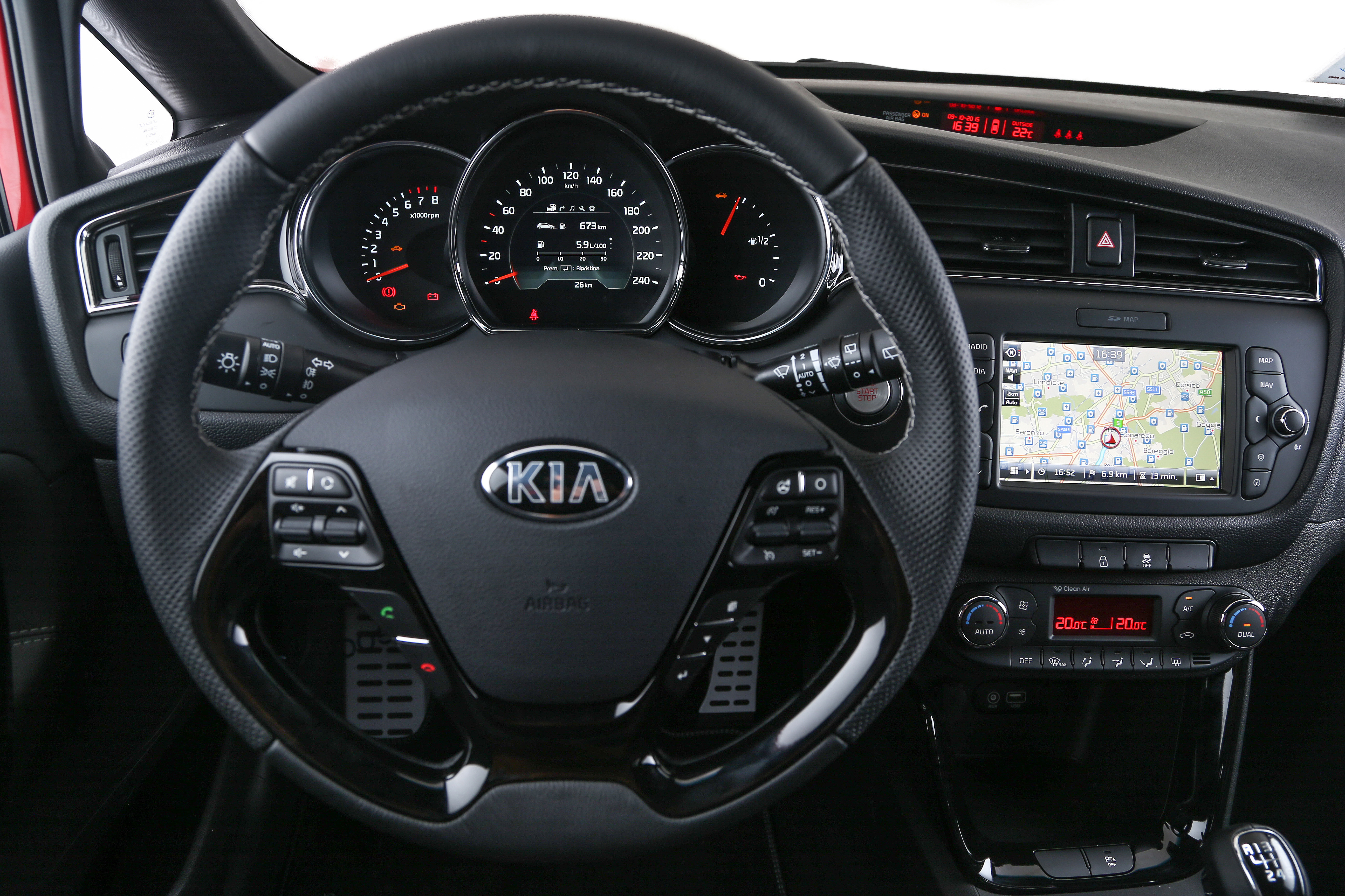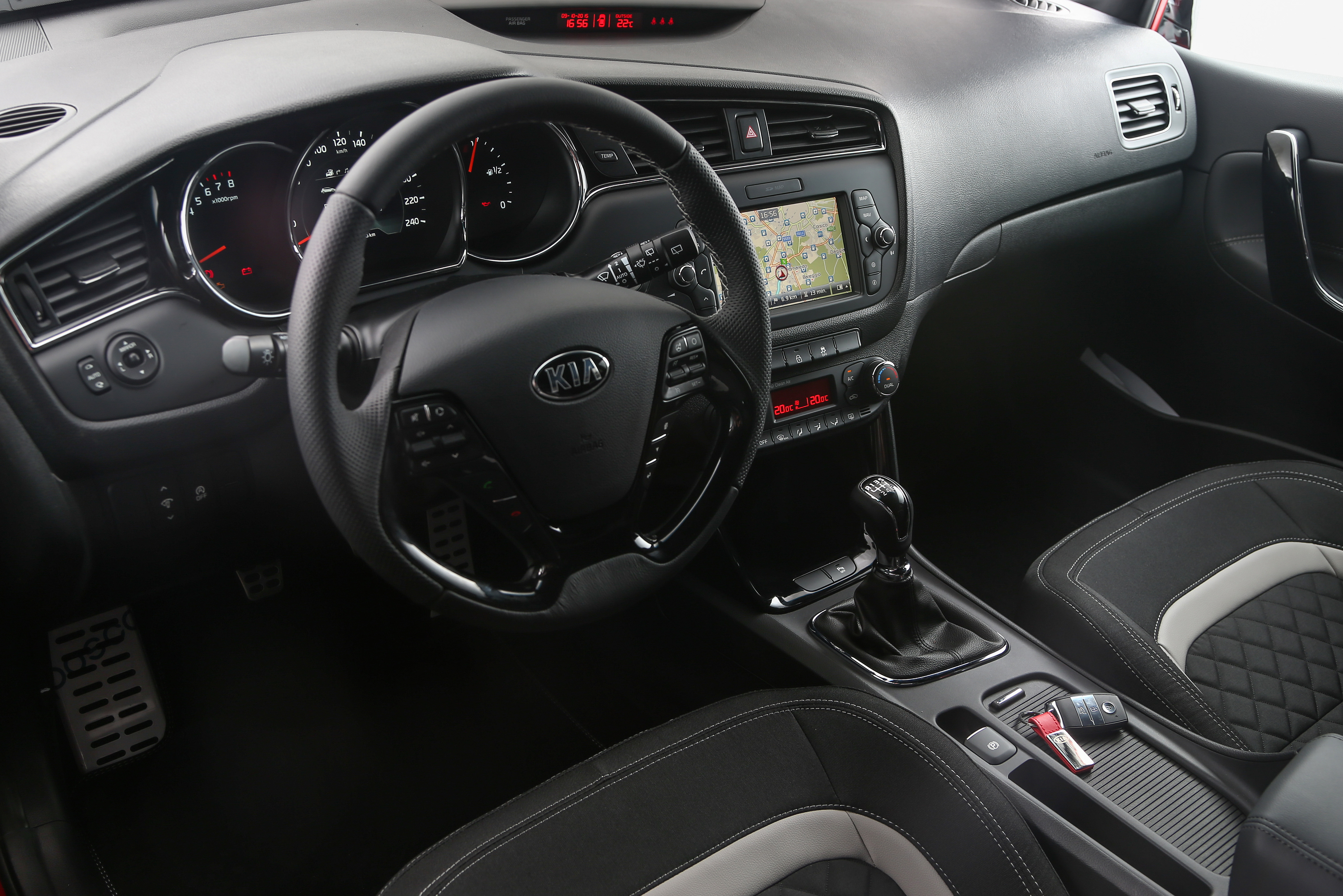 Nell’abitacolo della cee’d, Kia ha confermato la qualità (non solo percepita) dei materiali, apportando ulteriori migliorie che lo rendono ancora più accogliente e raffinato e si pone a un ottimo livello. Il cruscotto asimmetrico, orientato verso il posto guida, appare ancora più prezioso grazie ai profili lucidi che segnano la strumentazione e le bocchette di climatizzazione. La console centrale ha una più ricercata finitura antigraffio nero lucido che contrasta con le modanature cromate alla base della leva del cambio e sui pannelli porta.