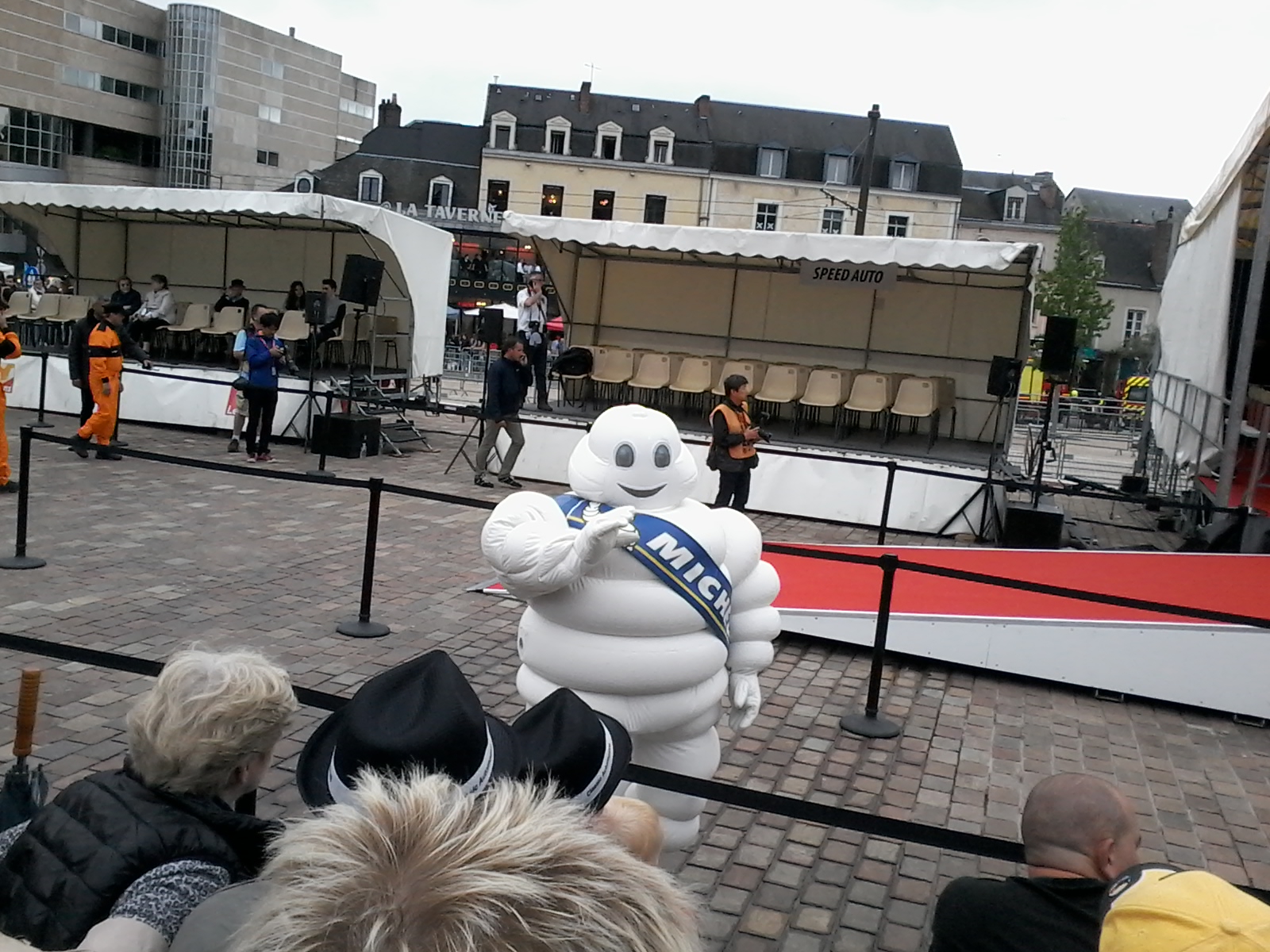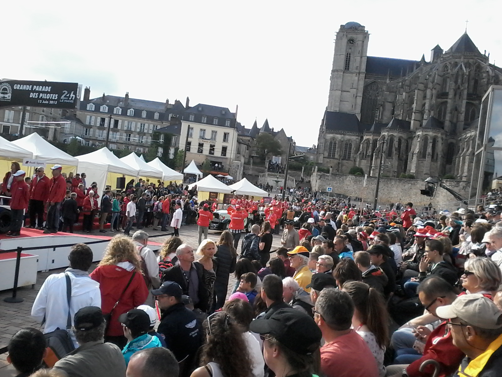 Tanta gente, ordinatissima ed entusiasta, in attesa di veder passare i piloti. Un vero e proprio show, con tanto di presentatore… passano tutti, su auto moderne e d’epoca, lanciano gadget, cappellini, caramelle, foto alla gente seduta in tribuna, la cattedrale sulla destra. Di colpo esce il sole. Prima di partire Ermanno Alboreto mi aveva dato un compito: non tornare senza andare al monumento dove attorno ci sono tutte le impronte dei vincitori di Le Mans. Ho espresso il desiderio e gli amici di Michelin l’hanno esaudito, abbiamo camminato un bel po’, tra la folla che seguiva la parata nelle strade, ed è stato uno spettacolo nello spettacolo. Poi siamo arrivati e l’emozione è stata forte per tutti, per me trovare le mani di Michele e appoggiarci le mie e virtualmente quelle di Ermanno e di tutti gli amici…