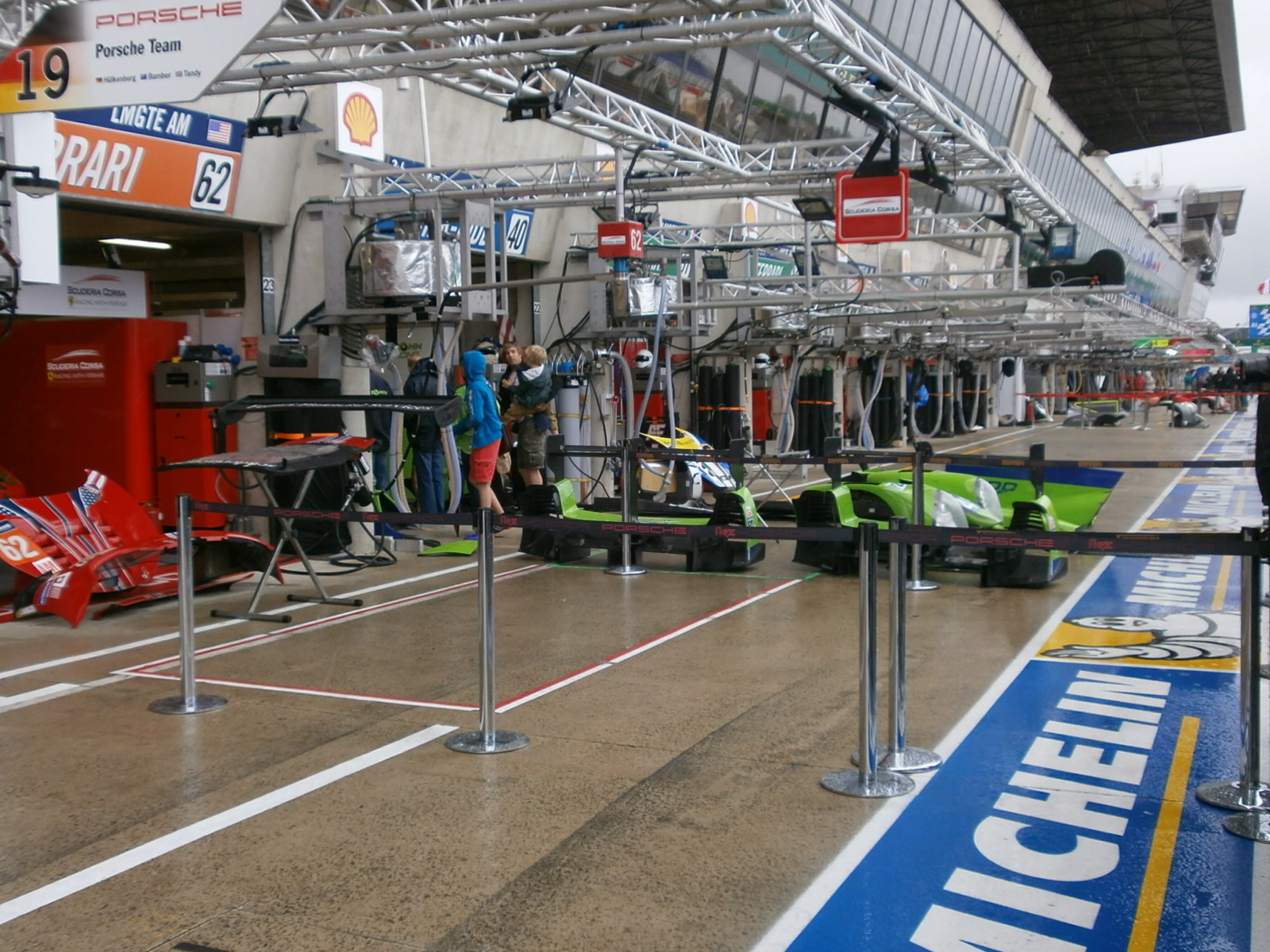 Di colpo arriva l’alba e toglie il fiato… ci riportano in hotel, mezz’ora per fare la doccia (che ci OLYMPUS DIGITAL CAMERAvuole!), prendere i bagagli e si torna in circuito. Ed è il momento di prendere contatto con il mondo Michelin. La 24 Ore di Le Mans rappresenta una grande sfida per tutti i team e gli uomini che vi partecipano e ovviamente anche per il Costruttore francese, in termini di organizzazione e logistica, che devono essere perfette proprio come gli pneumatici. Se per il pubblico la corsa 2015 ha avuto inizio il 10 giugno, con la prima sessione di qualifiche, per Michelin la 24 Ore è iniziata due mesi prima nello stabilimento di Cataroux, a Clermont-Ferrand, dove vengono prodotti ben 7.000 pneumatici, trasportati da 15 camion a Le Mans. In circuito, Michelin dispone di un deposito temporaneo di 900mq: da qui gli pneumatici vengono consegnati al momento e nel posto richiesti, con trasporti ottimizzati per minimizzare le emissioni di C02.