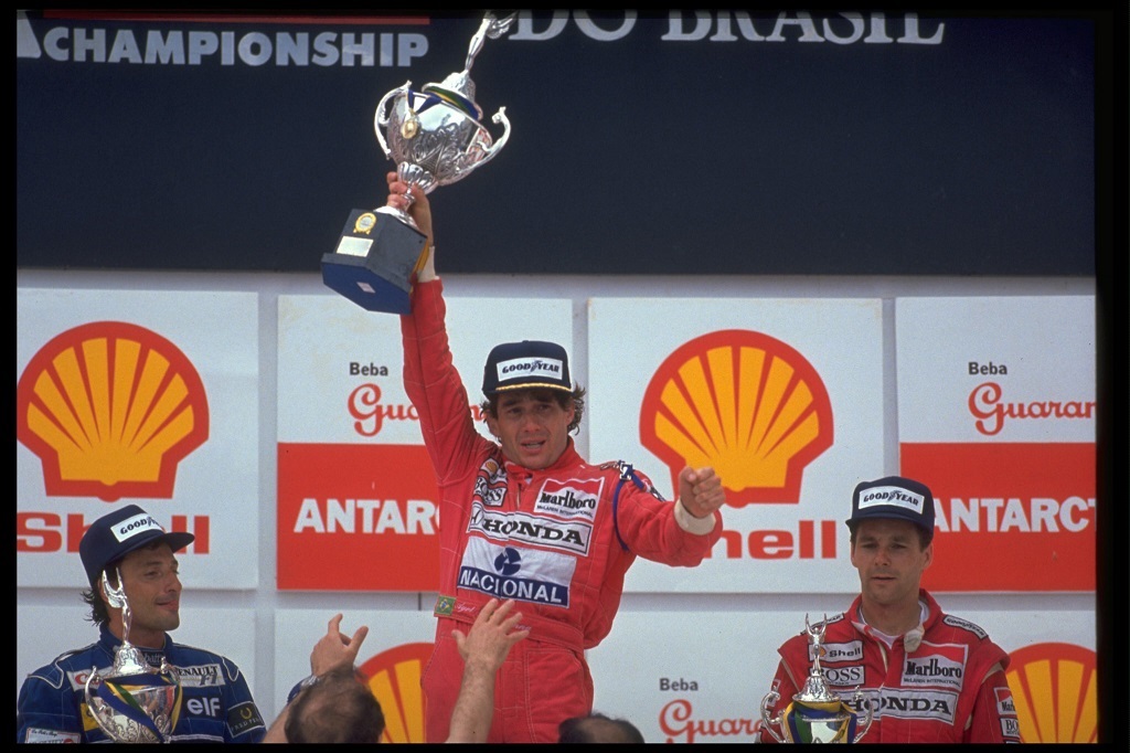 INTERLAGOS (BRASILE) 24-03-1991-AYRTON SENNA ALZA IL TROFEO DELLA VITTORIA TRA RICCARDO PATRESE E GERHARD BERGER. E’ LA PRIMA VOLTA CHE IL PILOTA BRASILIANO VINCE DAVANTI AI SUOI TIFOSI. © FOTO ERCOLE COLOMBO