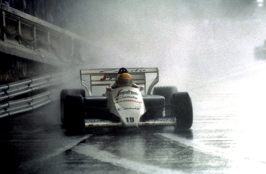 MONACO 1984-AYRTON SENNA CON LA TOLEMAN HART SOTTO IL DILUVIO IN RECUPERO SU PROST TERMINERA’ LA SUA GARA AL SECONDO POSTO CONQUISTANDO IL PRIMO PODIO IN CARIERA © FOTO ERCOLE COLOMBO