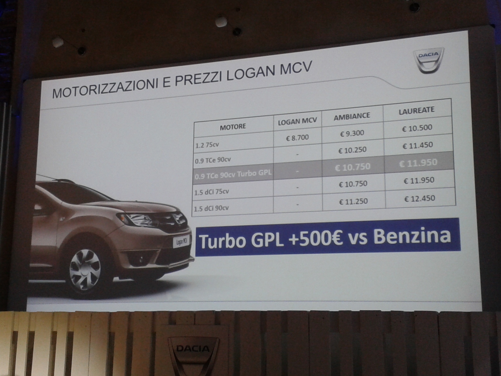 Un commento merita anche Dacia Logan MCV che, pur appartenendo alla famiglia Sandero, con la quale condivide una piattaforma comune di produzione, si colloca nel segmento C grazie Dacia_74400_it_italle sue dimensioni generose con una capacità di carico record, data dal volume del vano bagagli di 573 litri, tra i primi nella sua categoria, e dai numerosi vani portaoggetti, per una capienza totale di 16 litri. Logan MCV è proposta in tre livelli di equipaggiamento: Logan MCV, Ambiance e Laureate ed è disponibile nelle motorizzazioni benzina 1.2 75cv e 0.9 TCe 90cv e nelle motorizzazioni diesel 1.5 dCi 75cv e 1.5 dCi 90cv. Da oggi la motorizzazione 0.9 TCe 90cv è disponibile anche con il Turbo GPL S&S Euro 6 (98 g CO2/km – 6,2 l /100 km) con prezzi a partire da 10.750 € (allestimento Ambiance).