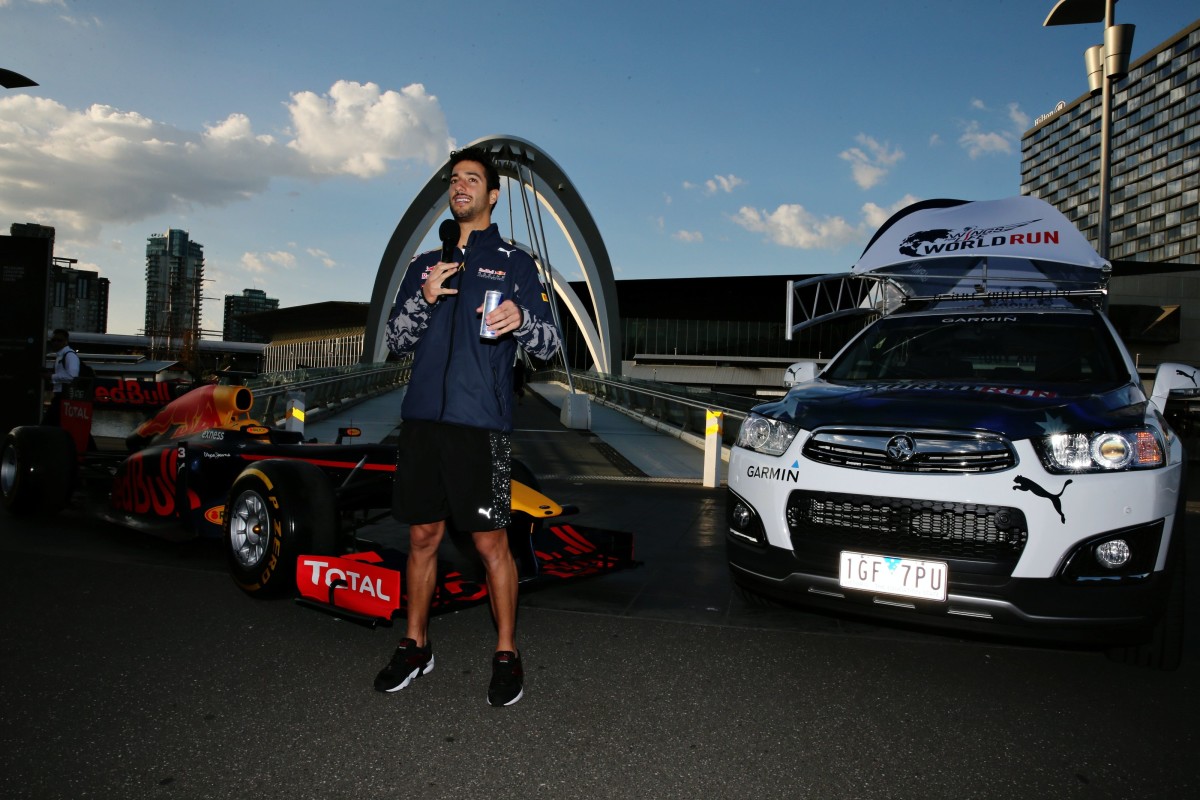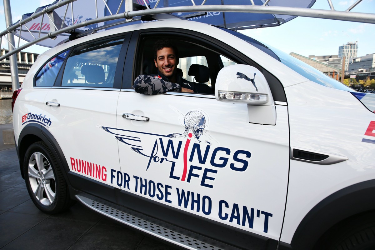 A proposito della Wings for Life World Run, Ricciardo ha dichiarato: “Le prime due edizioni hanno avuto un ottimo successo di pubblico: oltre 100.000 persone hanno partecipato alla gara del 2015. E’ un evento mondiale unico e incredibile: si corre in contemporanea nei 5 continenti, i runner partono esattamente alla stessa ora e scappano dalla Catcher Car che li insegue! E il 100% del ricavato è devoluto per supportare la ricerca sulle lesioni al midollo spinale. Io correrò a Cambridge in Inghilterra“.