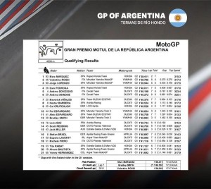 Sarà il campione del Repsol Honda Team Marc Marquez a partire davanti a tutti nel GP d’Argentina. Accanto a lui le Yamaha di Valentino Rossi e Jorge Lorenzo, in netto recupero sulle Honda a Termas de Rio Hondo ma ancora leggermente distanti dallo spagnolo. Le qualifiche della classe regina si aprono con le conseguenze di quanto successo nelle FP4 a Scott Redding del team Ducati Octo Pramac Yakhnich, la moto del britannico accusa un problema al posteriore: il pilota resta in piedi finisce nel prato nonostante il cedimento abbia distrutto il codino della moto. Le FP4 sono state sospese con bandiera rossa e poi riprese per gli ultimi 4 minuti durante i quali Jorge Lorenzo cade alla curva 1.