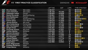 lasciati dalla Williams di Felipe Massa e dalla Renault di Kevin Magnussen, sulle cui monoposto si sono sgonfiati i pneumatici posteriori per cause investigate al termine della sessione e non dovute alle gomme stesse ma a problemi tecnici, come comunicato da Pirelli e confermato dagli stessi team. Primo a scendere in pista, Sebastian Vettel ha debuttato e concluso la prova con pneumatici Soft, chiudendo in terza posizione (1.38.665), alle spalle delle due Mercedes di Nico Rosberg (1.38.037 ) e Lewis Hamilton (1.38.183). Quinto tempo per Kimi Raikkonen (1.39.155), che a differenza del compagno di squadra ha alternato le due mescole Medium e Soft.