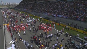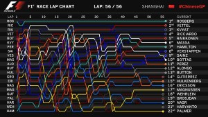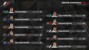 A un certo punto, prima della quarta sosta dopo 21 giri, Hamilton era terzo, approfittando delle soste ai box degli altri, ma altri due pit stop (per un totale di 5!) l’hanno fatto retrocedere in entrambe le occasioni. E’ arrivato a insidiare la 4° posizione della Williams di Massa, poi è stato passato da Ricciardo e Raikkonen. L’australiano ha così conquistato il 4° posto per la terza gara consecutiva, con Raikkonen 5°, seguito da Massa, Hamilton, i due della Toro Rosso Max Verstappen e Carlos Sainz e Valtteri Bottas a completare la top 10. Nonostante i numerosi contatti e incidenti, tutte e 22 le monoposto hanno completato la gara, il che ha quasi dell’incredibile, 66 i pitstop effettuati, con la Renault di Jolyon Palmer ultima alla bandiera a scacchi.