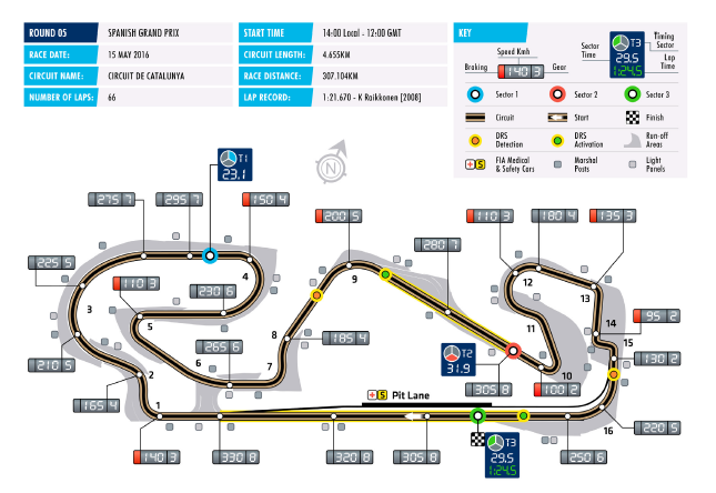 13-15 maggio 2016 – GP di Spagna – Circuit de Catalunya, 4,665 km, 66 giri, 307.104 km – Giro record: Kimi Raikkonen – 1:21.670 (Ferrari, 2008) – Limite di velocità nella pitlane: 80 km/h in prova, qualifica e gara- Pneumatici: hard (orange), medium (white) e soft (yellow) – Zone DRS: due con due detection point (curve 9 e 16). TV: Diretta Sky, differita Rai