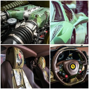 La Ferrari 458 è caratterizzata da una livrea camouflage, ottenuta grazie a un complesso procedimento di verniciatura a mano, utilizzando tre differenti gradazioni di verde e una di marrone. Lo stesso pattern militare è ripreso anche sulla cover del motore e sulle pinze freno. Completa la personalizzazione degli esterni il simbolo della pace in acciaio verniciato che ha sostituito il Cavallino Rampante sulle fiancate. All’interno dell’abitacolo, interamente rivestito in pelle marrone, troviamo inserti in Kevlar verniciati in verde per il cruscotto e i pannelli porta, abbinati al tunnel centrale sempre in Kevlar che riporta una targa metallica “458” con la firma di Lapo Elkann. Su sedili, cruscotto e pannelli porta risalta la pelle verniciata in stile camouflage.