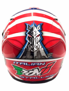 Ai lati le linee orizzontali a diminuzione progressiva riprendono la grafica che già dai test invernali di quest’anno è stata inserita nella tuta, utilizzando il blu, colore che “Dovi” ha scelto per distinguersi, e il rosso, colore della sua moto. La raggiera che si ottiene lateralmente è stata fatta per dare risalto e luce al casco. Nel retro del casco i due cavalli, nero e bianco (ragione e follia), che ormai lo contraddistinguono, sono riassunti in un’unica testa di cavallo, massiccio e arrabbiato, che richiama lo stallone italiano del primo film di “Rocky Balboa” interpretato dal noto attore Sylvester Stallone. Dovizioso si era già ispirato nel 2011 a questo personaggio schivo e umile ma forte, rude e allo stesso tempo romantico: tuttora è una sua icona e le sue musiche sono sempre di grande ispirazione e impatto emotivo per il pilota forlivese.