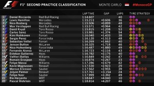 Settimo Kimi Raikkonen davanti alla Force India di Sergio Perez, in un pomeriggio difficile per la Ferrari: il finlandese è a 1.4s da Ricciardo, con Sebastian Vettel 9°, dopo un testacoda alla Mirabeau a metà sessione, in cui ha danneggiato l’alettone posteriore, e poi ha toccato le barriere alla Ste Devote nelle fasi finali. A chiudere la top 10 la McLaren di Jenson Button.