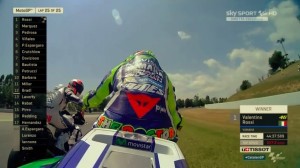 Primi due giri e Rossi segna il miglior tempo di 1:46.165s. Lorenzo è in testa e prova a staccare le Honda, Marquez resiste mentre Pedrosa è distante e superato dal numero 46. Il pilota di Sabadell dà poi vita a un bel duello con il numero 25 Ecstar per la quarta piazza. I due combattono ma all’inizio del terzo giro ha la meglio il portacolori Repsol anche grazie a un errore dell’uomo Suzuki. Segue Iannone al sesto posto, poi Pol Espargaro e Dovizioso. Danilo Petrucci è 11° e Michele Pirro 18°.