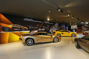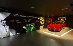 immergono immediatamente il visitatore nella sonorità inconfondibile delle vetture Lamborghini. Poi si incontra la prima automobile nata a Sant’Agata, la 350 GT del 1963 per scoprire, subito dopo, nel suo cinquantesimo anniversario, la ormai mitica Miura. Nell’area dedicata alla tecnologia, oltre ai motori più celebri, viene proposta la storia dell’evoluzione del Marchio attraverso i modelli che hanno introdotto le principali evoluzioni tecniche: la Diablo per le quattro ruote motrici, la P 140 per il telaio in alluminio, la Sesto Elemento per quello in carbonio e la Asterion per l’ibrido.