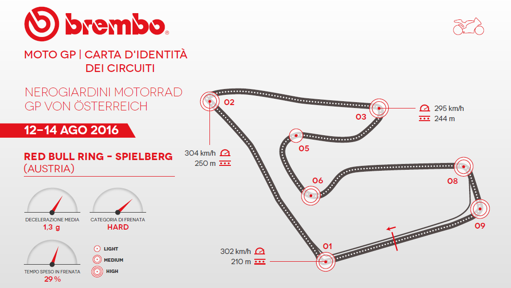 Dal 12 al 14 agosto il Red Bull Ring di Spielberg ospita il 10° appuntamento del Mondiale 2016 della MotoGP. Precedentemente noto come Österreichring, è stato riammodernato negli anni 2000 per volontà dell’omonimo produttore di bevande energetiche. La pista, ridisegnata da Hermann Tilke, è contraddistinta da rettilinei brevi (il più lungo misura solo 626 metri), curve secche e parecchie ondulazioni: la salita più ripida presenta 12 gradi di pendenza. A differenza della Formula 1, che su questa pista ha già corso 3 volte, la MotoGP è all’esordio. Secondo i tecnici Brembo, che hanno a che fare con tutti i piloti della MotoGP (Brembo fornisce il 100% dei piloti della classe regina), il Red Bull Ring rientra nella categoria dei circuiti impegnativi per i freni. In una scala da 1 a 5 si è meritato un indice di difficoltà di 4, ottenuto anche dalla pista di Brno e dai tracciati spagnoli di Jerez e Aragon.