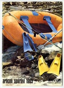 arricciature elastiche” all’Artena “a pannelli irregolari”, all’Armonia “che sottolinea la scollatura”.Una delle ragazze col costume in Lastex – quella di pagina 43 – sembra poi intenzionata a scendere in acqua su un Nautilus arancione. Con Pirelli, infatti, al mare possono succedere molte cose. Ad esempio prendere il largo su un battello pneumatico. Il “gommone” – lo produce la consociata Azienda Seregno – è la motorizzazione di massa riflessa sull’acqua: libertà, avventura, voglia di muoversi via dalla pazza folla. Ai tempi del Lastex e di Gianna Manzini il gommone Pirelli si chiama Nautilus, è di un color arancione squillante e le ragazze a bordo sorridono con aria innocente e felice. Gommone specchio dei tempi: di lì a un decennio sarà diventato Laros, di colore grigio e blu, e le ragazze a bordo guarderanno il fotografo con un’espressione seria e sicura di sè.