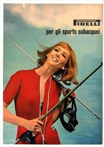 Una di loro veste una muta da sub, ha un pugnale fissato alla gamba, sta per calarsi la maschera subacquea sul viso. Via, verso le profondità sottomarine, con sguardo sempre serio e intenso. E allora ci torna in mente un’altra maschera subacquea Pirelli di tanti anni prima – era il 1949 – e un altro sguardo altrettanto intenso, quello di Ingrid Bergman. “Il miracolo della pesca subacquea” è il titolo dell’articolo della Rivista Pirelli n°3/1949: nel mare di Stromboli, il regista Rossellini porta Ingrid con sè in fondo al mare. Lei chiude gli occhi mentre indossa la maschera: “è come il paesaggio incantato delle mie fiabe nordiche”, dirà riemergendo.
