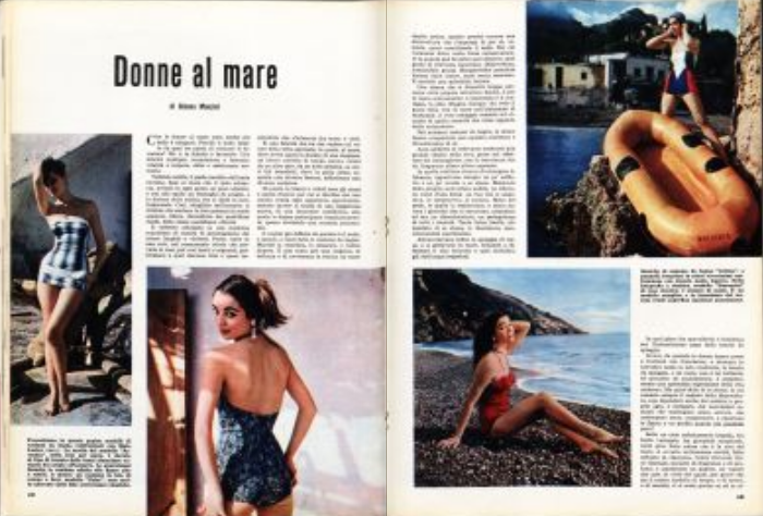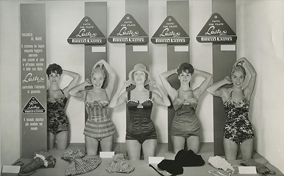 Né lui né lei si immaginano che di lì a qualche anno, nel 1952, la modella diventata intanto famosa avrebbe portato quegli scatti fotografici in una pubblicità dell’azienda italiana Pirelli. Perchè quel costumino rosa –non sappiamo se poi lo tolse – è fatto di un magico tessuto elastico, il Lastex, ottenuto filando fibre di caucciù. Lo produce la Pirelli-Revere, “società italoamericana del filo elastico”: nel corso degli anni 50 il Lastex conquista tutte le ragazze di tutte le spiagge del mondo.
