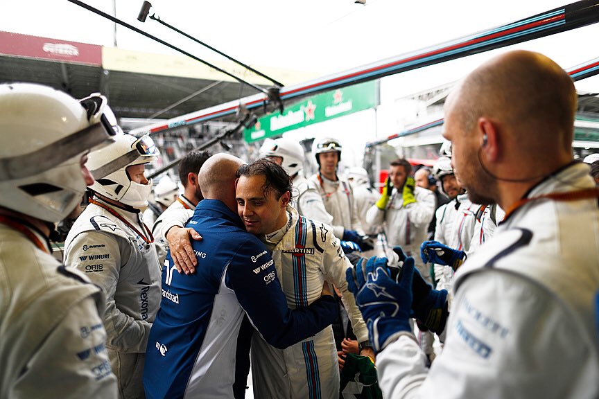 E poi arriviamo all’oggi, anzi allo scorso weekend, alla grande attesa ed emozione di Felipe per l’ultima gara davanti al suo pubblico, che purtroppo non è andata come avrebbe voluto. Un’altra delusione, un altro pianto, altra rabbia. Ma anche il tributo più grande che – crediamo – un pilota che lascia la Formula 1 possa avere: quando nel giro 47 è stato tradito dall’aquaplaning, sceso dalla sua Williams ha preso la bandiera del Brasile e ha percorso tutto il tratto fino alla pitlane, acclamato dagli spettatori in tribuna. Ma il tributo più grande è stato l’applauso e l’abbraccio di tutti i team. Più di un ultimo giro d’onore a Interlagos. Sembra solo ieri il suo debutto in Australia 2002 con la Sauber, sono passati 249 GP, 16 pole, 41 podii, 11 vittorie, 1122 punti e quel famoso miglior piazzamento in Campionato, il 2° posto del 2008. Ed è un gran peccato che Felipe lasci la Formula 1…