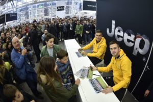 Dopo il primo posto nel girone di Champions League, un grande abbraccio ha accolto ieri al Motor Show Miralem Pjanic e Paulo Dybala. I due giocatori bianconeri, ospiti allo stand Jeep® all’interno del Motor Show, sono stati a disposizione dei numerosi fan per autografi, saluti, foto e selfie, dopodiché si sono spostati in un’area esterna al padiglione per uno speciale test drive sui SUV Jeep impegnati su un truck alto oltre sei metri. Juventus e Jeep sono accomunati da una tradizione vincente e dall’amore per il grande sport: questi sono i motivi per cui dalla stagione 2012/13 la squadra bianconera porta il marchio Jeep sul petto e per cui Jeep ha scelto di festeggiare, qualche settimana fa, i suoi 75 anni allo Juventus Stadium con uno spettacolo davvero unico che ha vissuto la sua naturale prosecuzione ieri al Motor Show insieme a migliaia di appassionati.