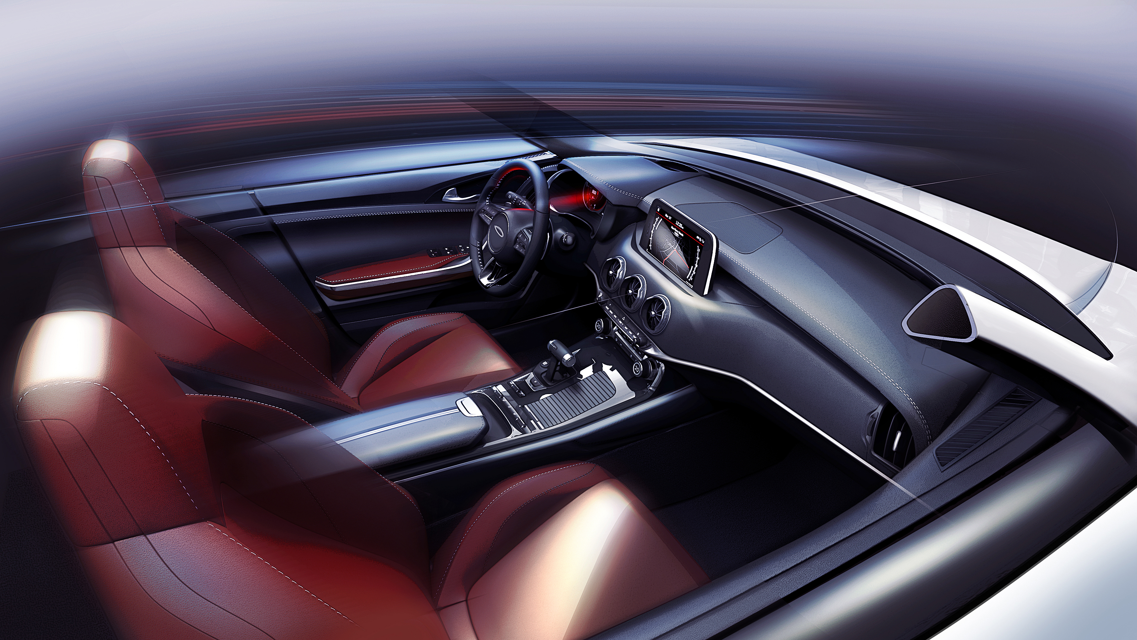 Dal frontale slanciato, alle fiancate tese, fino alle spalle pronunciate, la Stinger esprime forza ed eleganza, aiutata dal cofano imponente con sbalzo anteriore ridotto (830 mm) e dal posteriore pronunciato con uno sbalzo di ben 1.095 mm. Il risultato complessivo vede prevalere un’eleganza atletica rispetto all’aggressività corsaiola. Le dimensioni generose (4.830 mm di lunghezza e 1.870 di larghezza) sono ai vertici fra le berline sportive a tutto vantaggio della abitabilità e delle possibilità di carico.