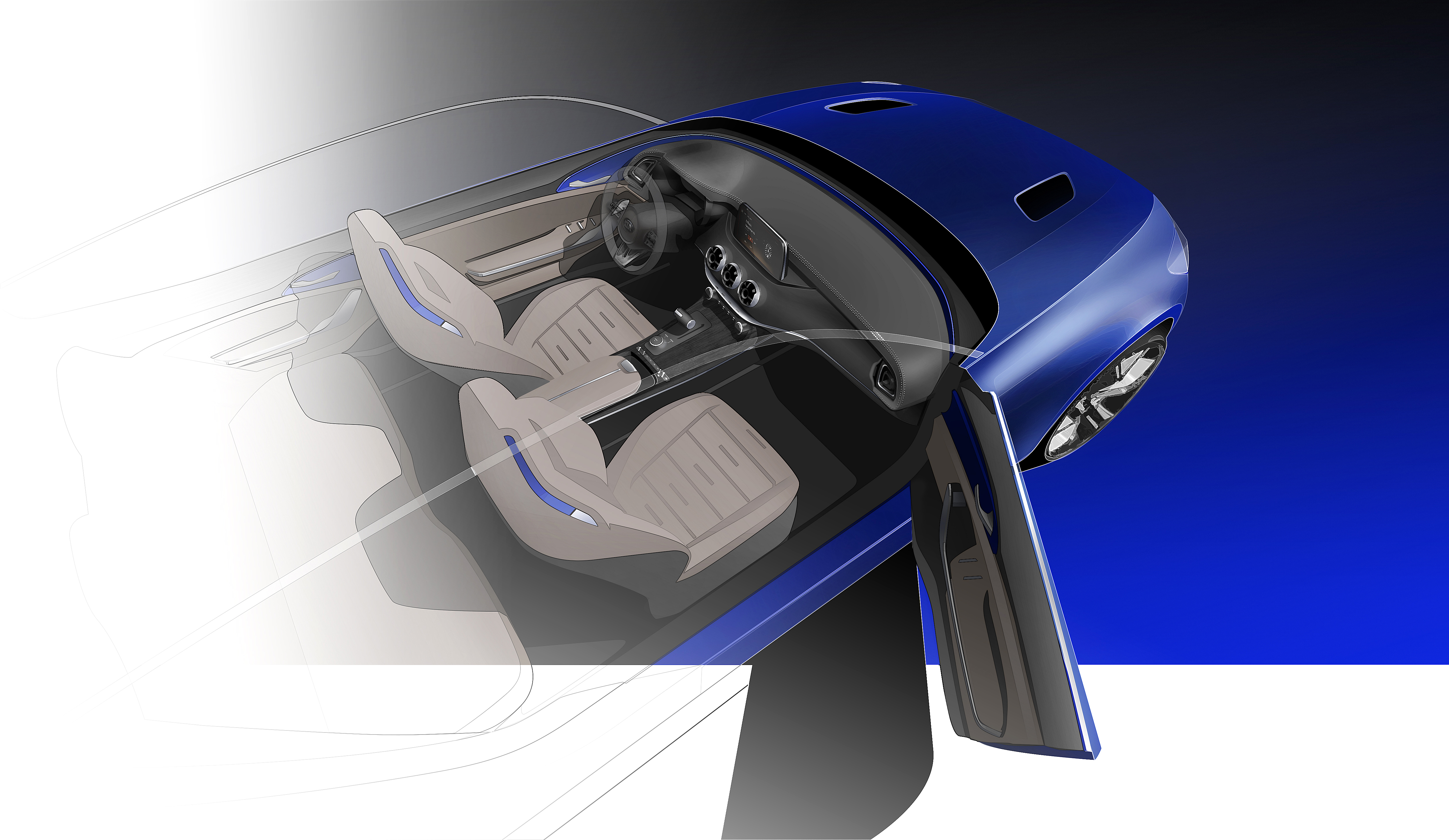 L’abitacolo rastremato si estende dal parabrezza fino all’estremità della coda per creare un profilo teso e slanciato. L’interno è pensato per dare il senso della guida gran turismo e allo stesso tempo coccolare i passeggeri in un ambiente raffinato e confortevole. L’impostazione della plancia ha un andamento orizzontale con la parte centrale suddivisa in due zone, con i