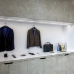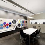 Gli esterni sono caratterizzati da ampie vetrate e dall’insegna con logo Lamborghini illuminato su fondo nero. Gli spazi interni sono luminosi ed essenziali, caratterizzati da poligoni, forme affilate, superfici dalle texture grezze. L’esperienza del cliente è arricchita dalla presenza di elementi digitali, tra cui un videowall di grandi dimensioni, che proietta filmati di brand e prodotto, e dalla saletta Ad Personam con car configurator e un display di campioni di finiture, dove i clienti possono toccare fisicamente, abbinare e giocare con colori e materiali. Infine, alla linea di abbigliamento e accessori della Collezione Automobili Lamborghini è dedicata un’area all’ingresso, visibile sia dall’interno sia dalle vetrine dello showroom.