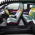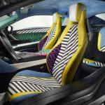 verniciatura per ricreare i singoli pattern: sono ben otto gli strati di colore applicati sulla carrozzeria, un numero che testimonia l’elevata complessità dell’intero processo. Entrambi gli interni sono ancora una volta una chiara espressione della stessa filosofia di rottura e di sperimentazione propria del Memphis Design, che ritroviamo nella scelta di impiegare differenti materiali per i rivestimenti (tessuto tecnico, Alcantara® e pelle Foglizzo), con abbinamenti cromatici in forte contrasto tra di loro. A farla da padrone sono quindi i colori accesi, dal viola all’arancione, dal giallo al verde, con pattern grafici stampati su misura. Ogni singolo elemento dell’abitacolo diventa così parte integrante di quel linguaggio artistico che sconvolse gli anni 80 e influenzò il mondo del design e dell’arredo negli anni successivi.