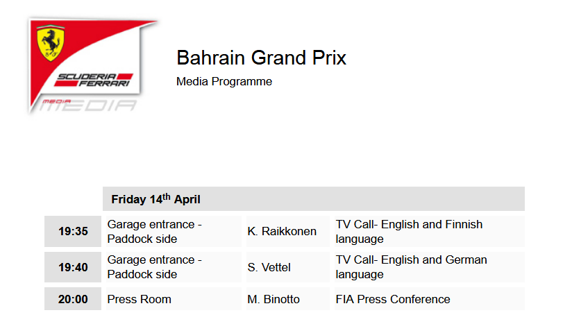 La Scuderia è stata un po’ più “aperta” in Cina, ma il giovedì in Bahrain il ‘media blackout’ è tornato, con Sebastian Vettel e Kimi Raikkonen che non hanno fatto incontri con la stampa. Secondo il tedesco Sport1, un portavoce del team avrebbe detto che Vettel era impegnato con eventi degli sponsor e non sarebbe stato “carino” dare l’intero carico a Raikkonen. E infatti oggi, come da programma che vedete in basso, solo TV Call, niente Press meeting. Una cosa è certa: speriamo che presto questo equilibrio venga trovato perché vi assicuriamo che non è bello non avere comunicazione e non ricevere più via mail i comunicati stampa post-libere, qualifiche e gara nel corso del weekend, come sempre avvenuto. Per info, le dichiarazioni post-libere sono state pubblicate alle 21.00 sul sito.